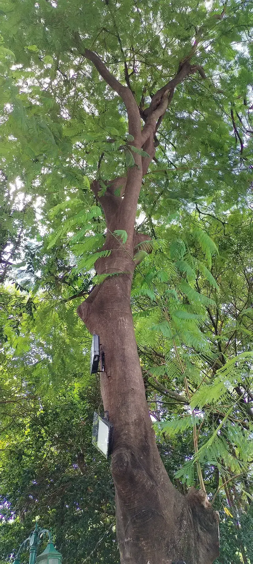 Le Flamboyant (Delonix regia) est un arbre caduc réputé pour sa floraison spectaculaire et son feuillage léger et délicat. Il peut atteindre 10 à 15 mètres de hauteur, avec un port étalé pouvant dépasser 15 mètres d’envergure.